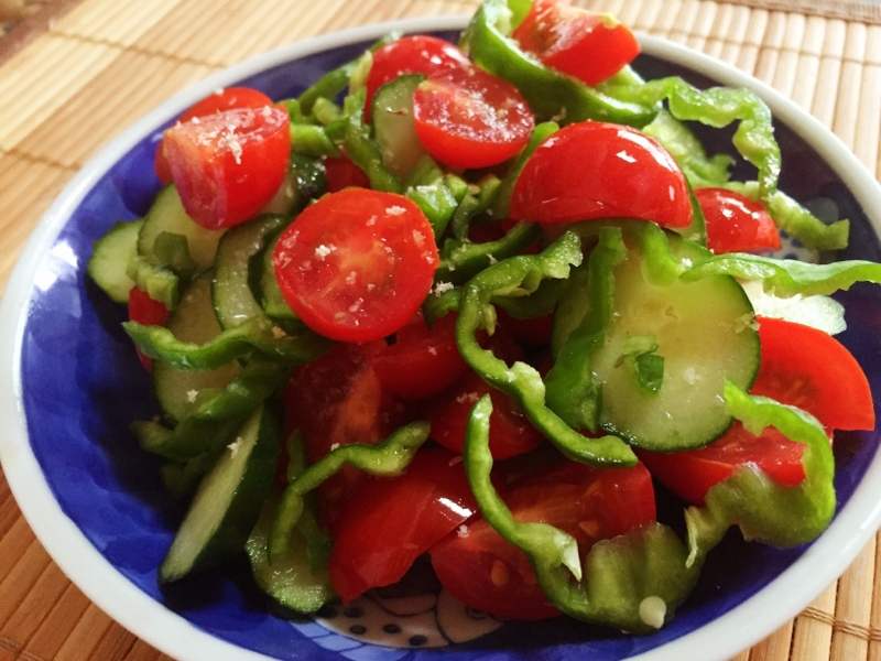 色鮮やか ミニトマト きゅうり ピーマンのサラダ レシピ 作り方 By たかまさ 楽天レシピ